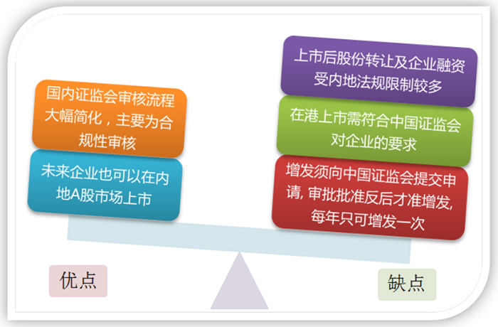 | 上市后增發(fā) | 須向中國證監(jiān)會提交申請,審批批準反后才準增發(fā),每年只可增發(fā)一次 | 可利用一般授權,不限次數(shù)每年增發(fā)不多于20%新股,無須向內(nèi)地監(jiān)管機構申請,故靈活性及自由度較大。如超過20%新股則需通過股東會 |