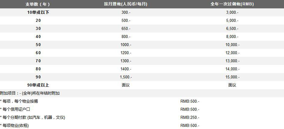 一般,報(bào)稅理賬是按照支單數(shù)的多少來收費(fèi)的,分按月理賬和全年一次理賬收費(fèi)。請依照下表查看對應(yīng)收費(fèi)標(biāo)準(zhǔn):