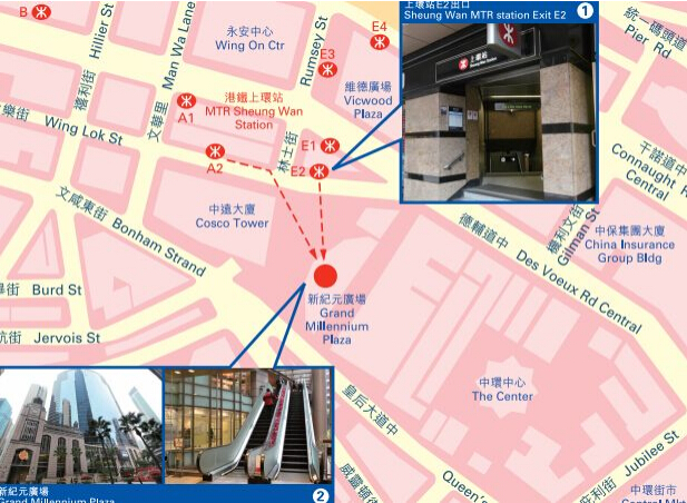 港鐵上環(huán)站E2出口,往左直走至永安百貨,對(duì)面即為新紀(jì)元廣場(chǎng)。