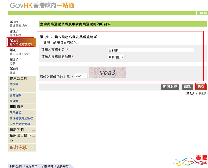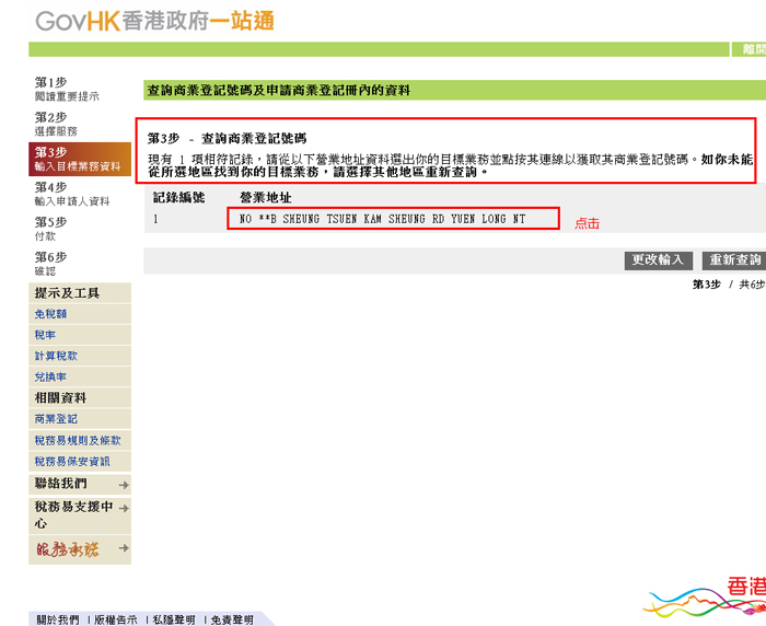 (查詢商業(yè)登記號(hào)碼)輸入業(yè)務(wù)名稱及其所處地區(qū)