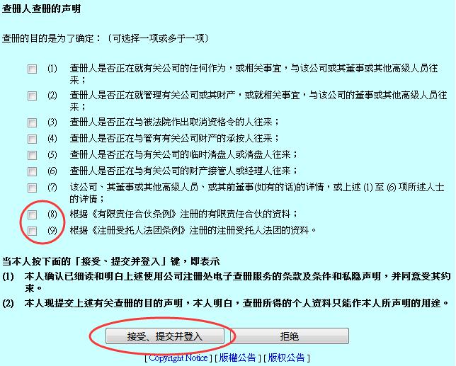 第二步:勾選查冊(cè)目的中的(8)(9)項(xiàng),然后點(diǎn)擊“接受、提交并登入”